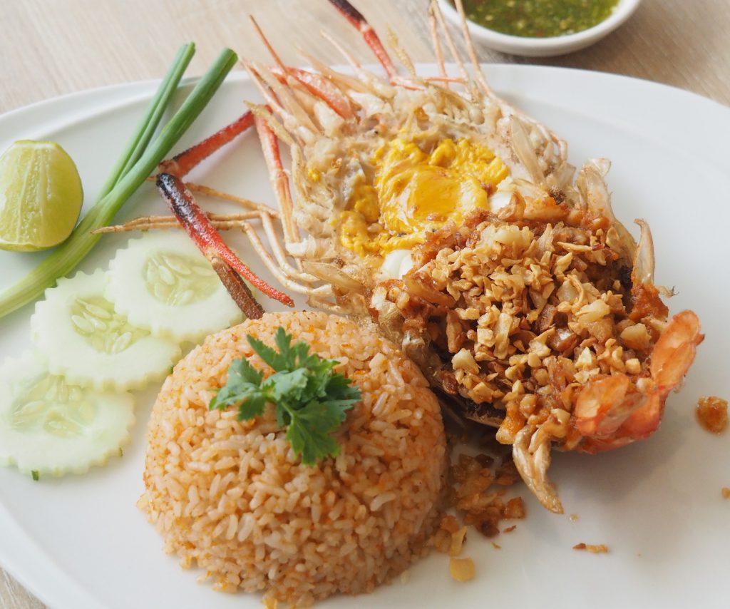 「バーンメーユイ」には他にも手長エビを使ったメニューがいくつかあり、こちらもおすすめ。エビ味噌がたっぷり入った手長エビをニンニクと一緒に揚げた「クンメーナムトードガティアム」(285バーツ)は、甘みいっぱいのプリプリの身が楽しめ、こちらも大人気メニューのひとつ。