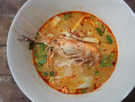 「ヤムクンヌードル」(60バーツ)。大きな手長エビが入っているのにも関わらずこのお値段は破格